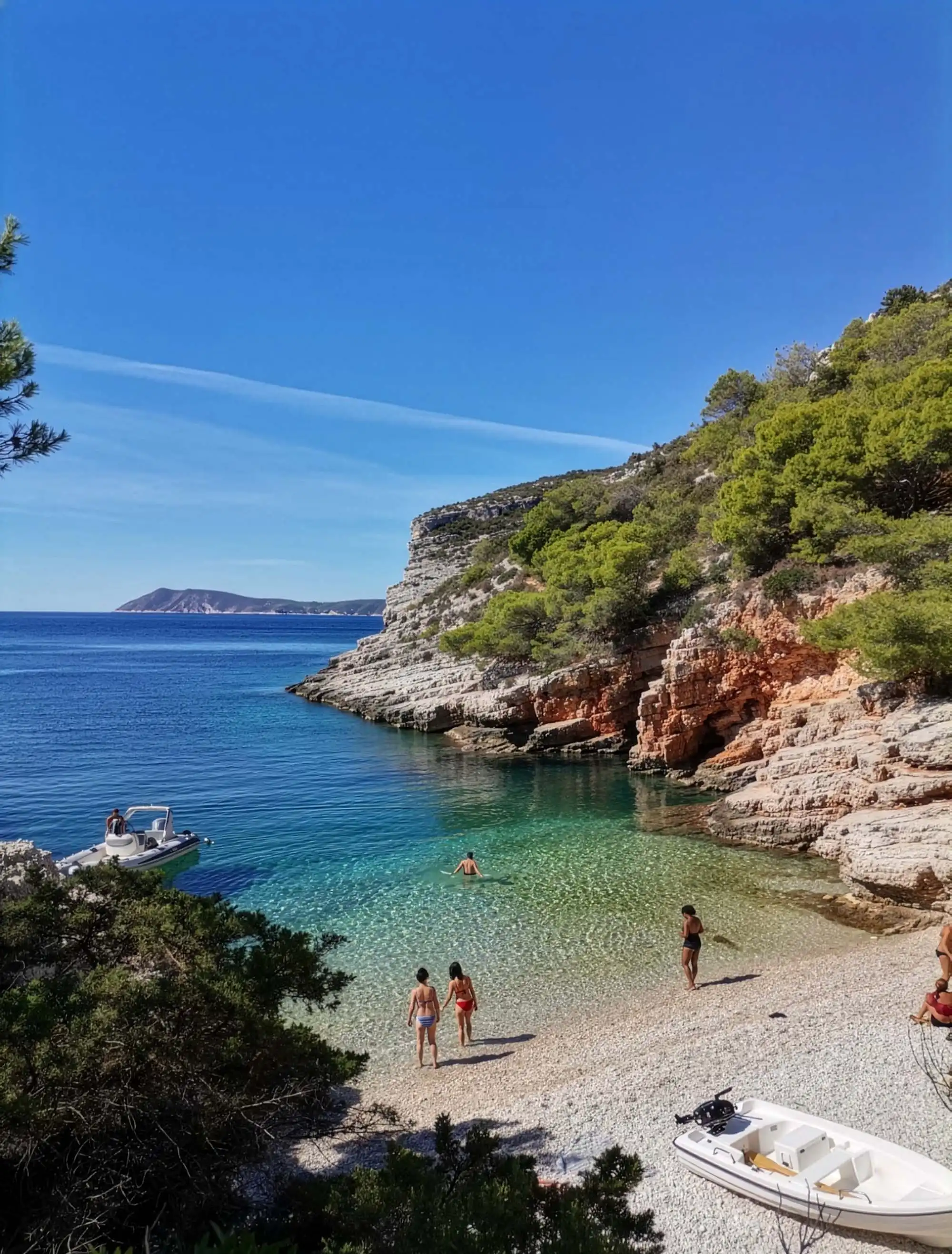 4 In a serene lagoon guarded by Mali Budikovac and Sanak islands, discover the Budikovac and Perna beaches with inviting turquoise waters. One resident tends to a year-round vegetable garden, animal farm, and a seasonal Dalmatian cuisine restaurant, all set against the vivid backdrop of the azure sea.