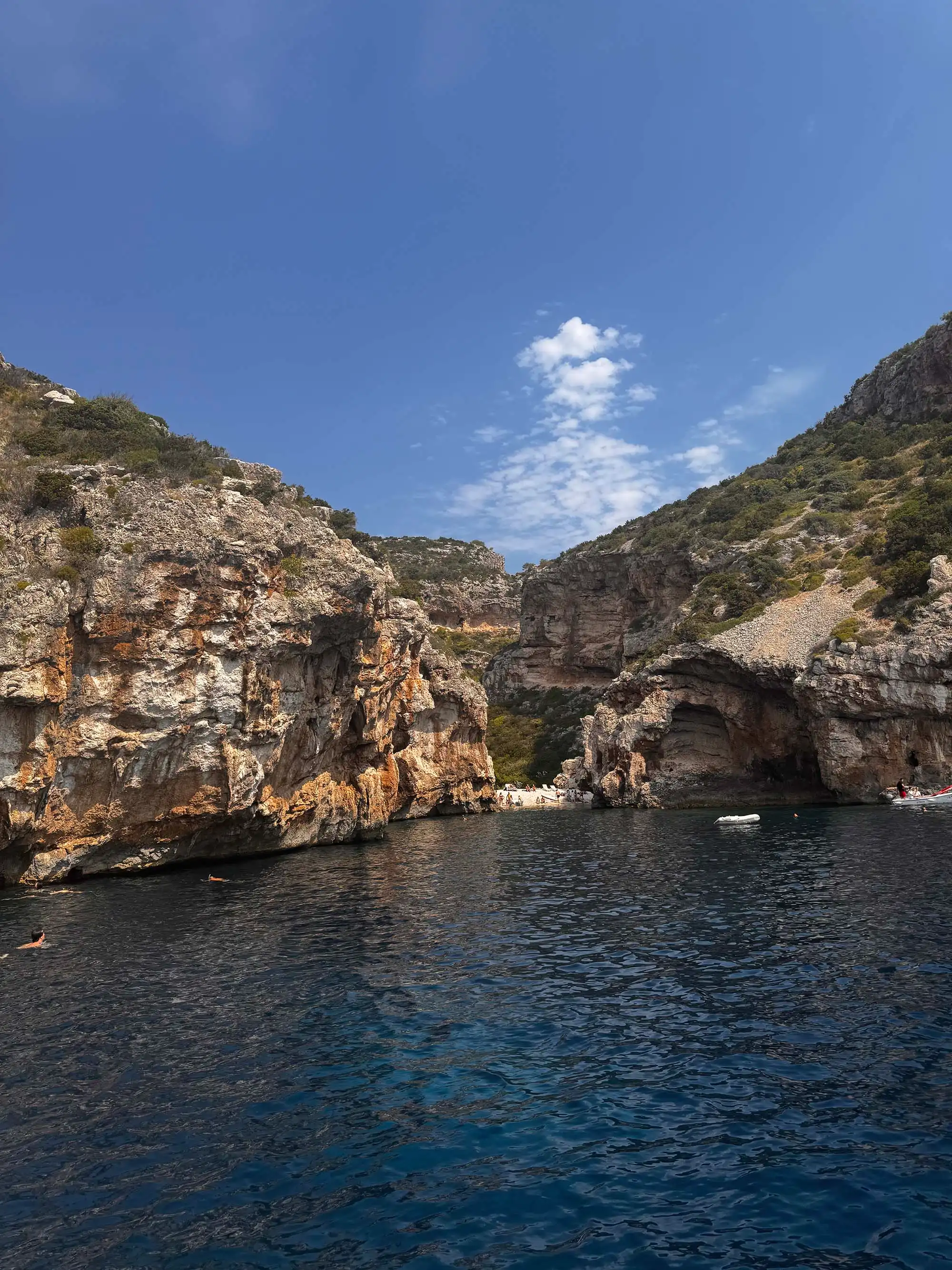 2 Stiniva Bay, voted Europe's most beautiful beach, boasts high cliffs framing a pebble beach with clear turquoise waters. The protected area since 1967 has a geological history from the ice age, featuring a collapsed karst cave and impressive hanging cliffs. Sea level rise sculpted the pebbled shoreline from dinosaur-era limestone rocks, revealing fossilized shell remnants.