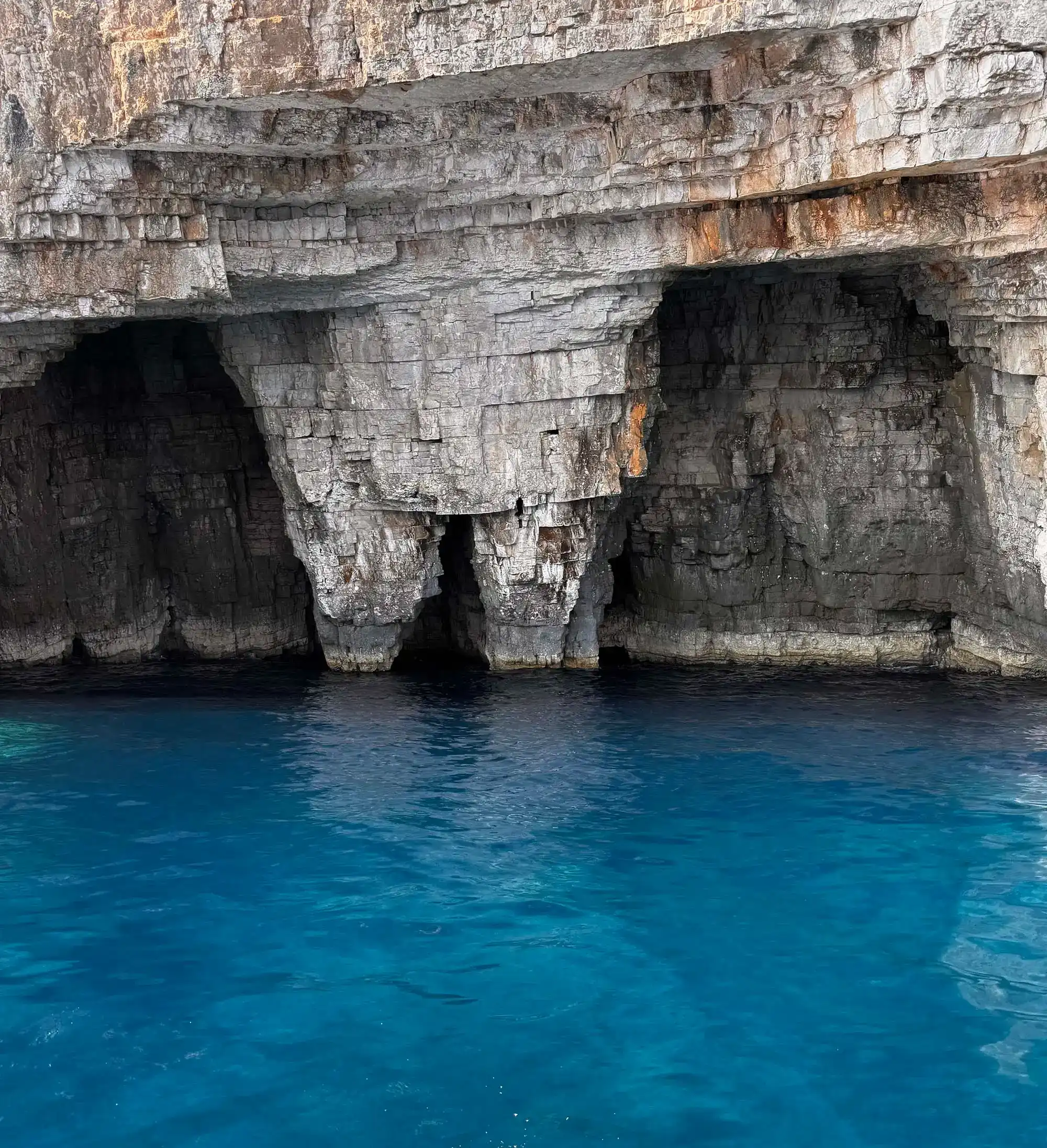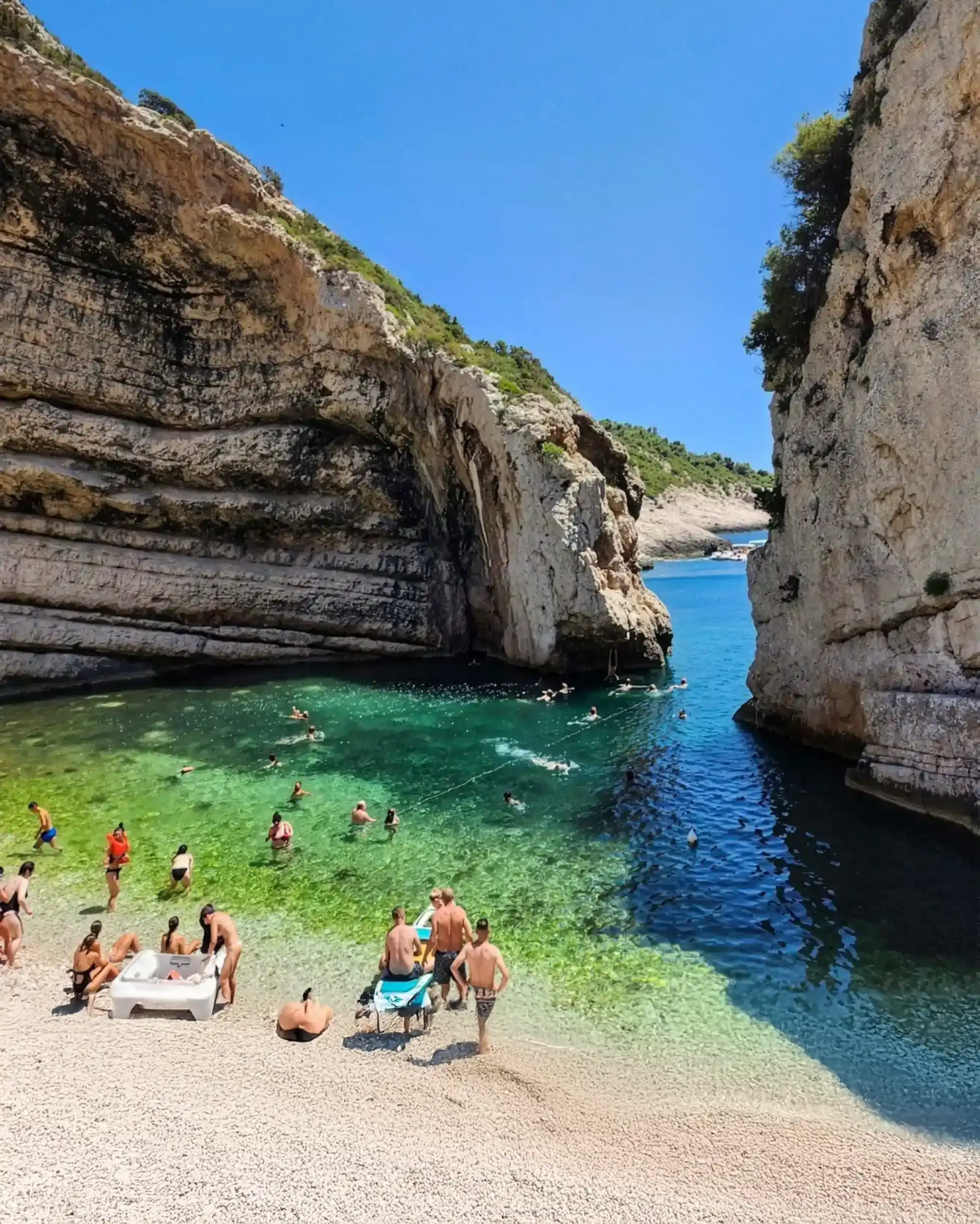 2 Stiniva Bay, voted Europe's most beautiful beach, boasts high cliffs framing a pebble beach with clear turquoise waters. The protected area since 1967 has a geological history from the ice age, featuring a collapsed karst cave and impressive hanging cliffs. Sea level rise sculpted the pebbled shoreline from dinosaur-era limestone rocks, revealing fossilized shell remnants.